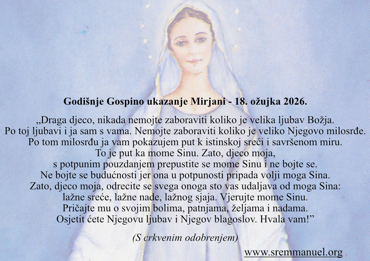 « Chers enfants, n’oubliez jamais combien l’amour de Dieu est grand. C’est à travers cet amour que je suis moi aussi avec vous. N’oubliez pas combien sa miséricorde est grande. À travers cette miséricorde, je vous montre le chemin vers le vrai bonheur et la paix parfaite. C’est le chemin vers mon Fils. C’est pourquoi, mes enfants, abandonnez-vous à mon Fils avec une confiance totale et n’ayez pas peur. N’ayez pas peur de l’avenir car il appartient entièrement à la volonté de mon Fils. C’est pourquoi, mes enfants, renoncez à tout ce qui vous éloigne de mon Fils : le faux bonheur, la fausse espérance, la fausse splendeur. Croyez en mon Fils. Parlez-lui de vos douleurs, de vos souffrances, de vos désirs et de vos espérances. Vous ressentirez son amour et sa bénédiction. Merci. »