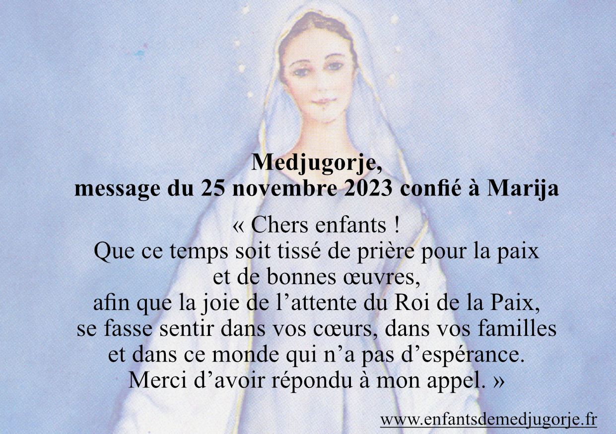 « Chers enfants ! Que ce temps soit tissé de prière pour la paix et de bonnes œuvres, afin que la joie de l’attente du Roi de la Paix, se fasse sentir dans vos cœurs, dans vos familles et dans ce monde qui n’a pas d’espérance.